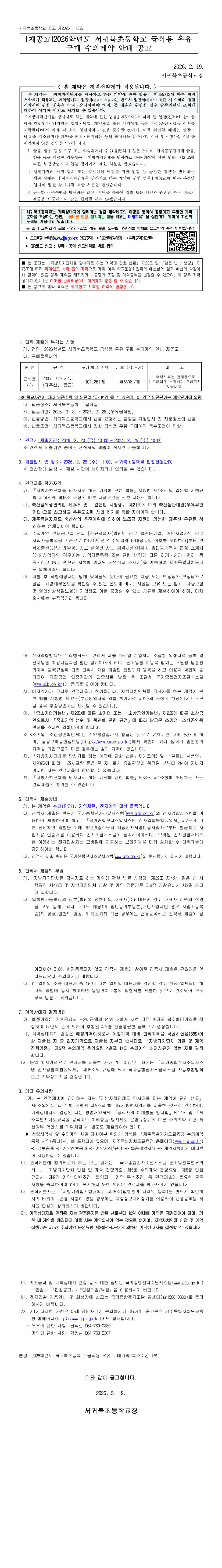 [재공고]2026학년도 서귀북초등학교 급식용 우유 구매 수의계약 안내공고 |