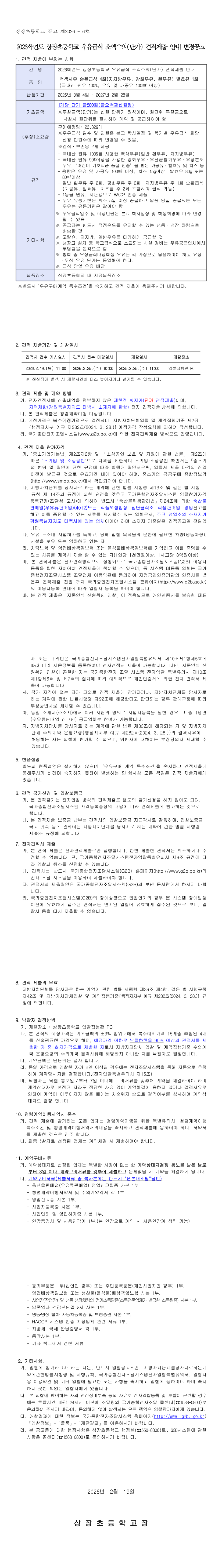 2026학년도 상장초등학교 우유급식 소액수의(단가) 견적제출 안내공고 |