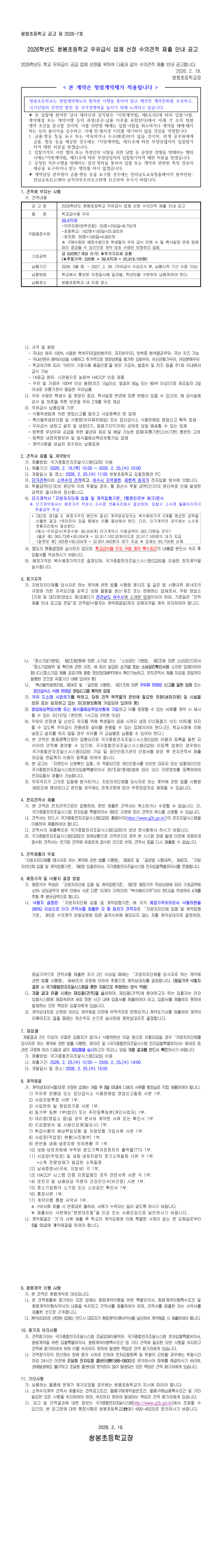 2026학년도 쌍봉초등학교 우유급식 업체 선정 수의견적 제출 안내 공고 |