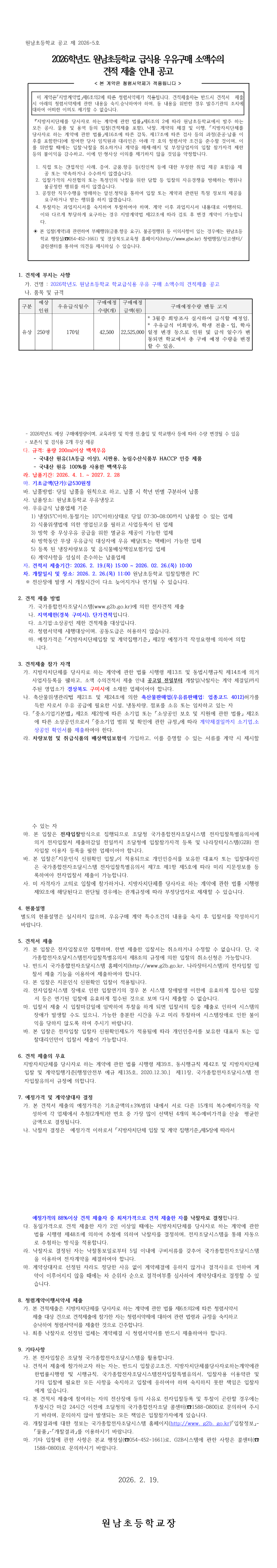 2026학년도 원남초등학교 급식용 우유구매 소액수의 견적 제출 안내 공고 |