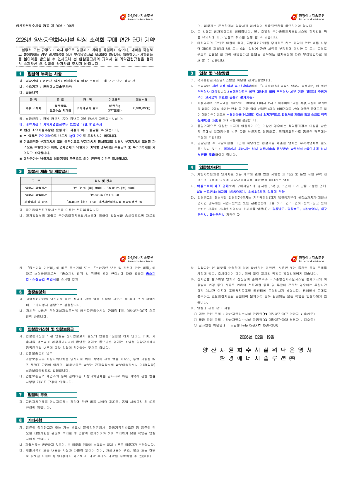 2026년 양산자원회수시설 액상 소석회 구매 연간 단가 계약 |