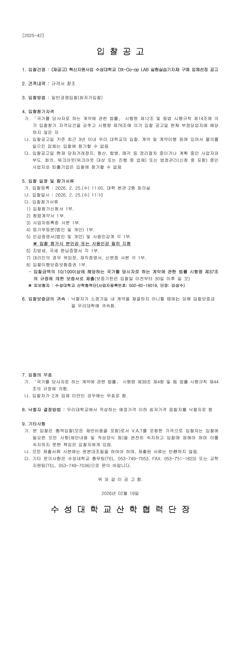 (재공고)혁신지원사업 수성대학교 DX-Co-op LAB 실험실습기자재 구매 업체선정 공고 |