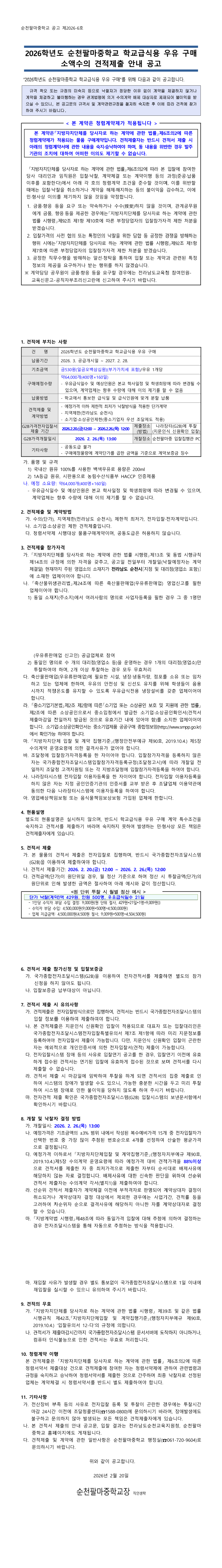 2026학년도 순천팔마중학교 학교급식용 우유 구매 소액수의 견적 제출 안내 공고 |