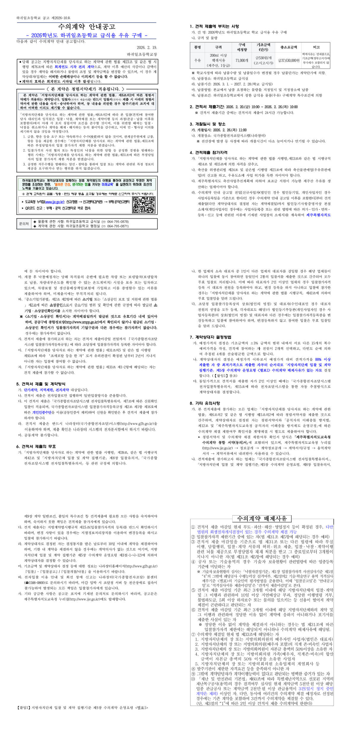 하귀일초등학교 2026학년도 급식용 우유 구매 수의계약 견적제출 안내 공고 |
