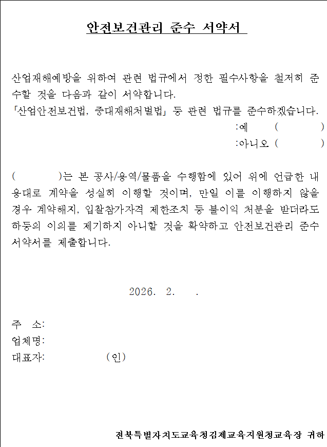 나. 본 입찰에 참가하고자하는 자는 중대채해 예방을 위한 안전 및 보건 확보 의무사항을 숙지하신 후 입찰에 응하여야 하며, 계약 체결 시에 【붙임 1】「안전보건관리 준수 서약서」를 제출하여야 합니다.
