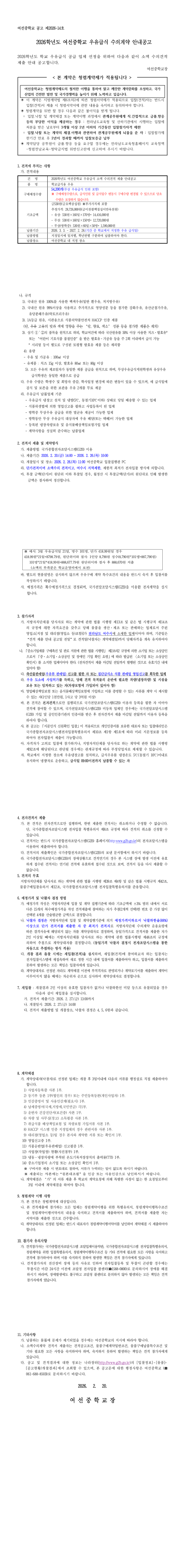 2026학년도 여선중학교 우유급식 2인수의 견적 요청 |
