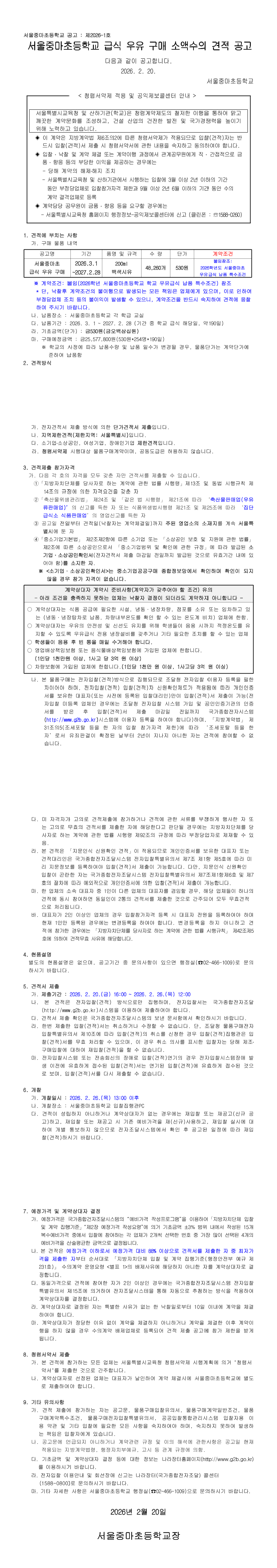2026학년도 서울중마초등학교 급식 우유 구매 소액수의견적 공고 |