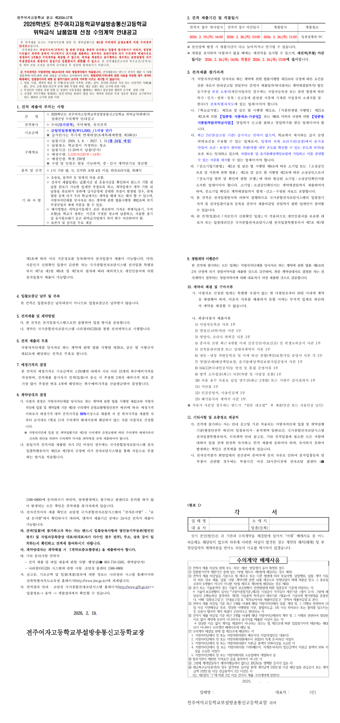 2026학년도 전주여자고등학교부설방송통신고등학교 위탁급식(뷔페식) 납품업체 선정 수의계약 안내 공고(단가계약) |