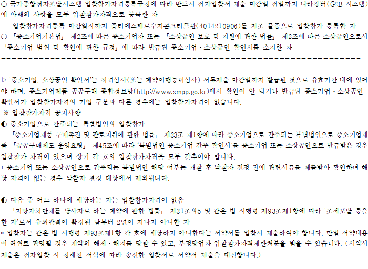 ○ 이 입찰은 「지방자치단체를 당사자로 하는 계약에 관한 법률」 제13조 제2항 제1호 및 같은 법 시행령 제42조 제1항 및
