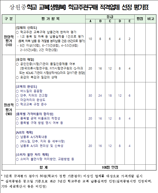 2026학년도 상원중학교 생활교복(동복·하복) 학교주관구매 입찰