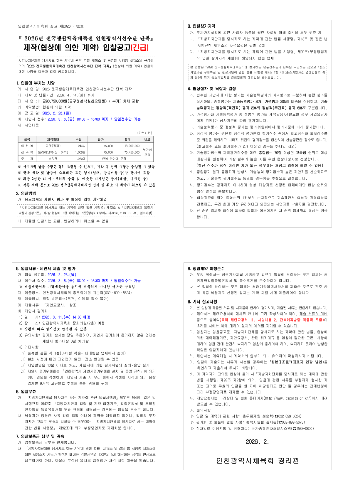 2026 전국생활체육대축전 인천광역시선수단 단복 제작 입찰공고 |