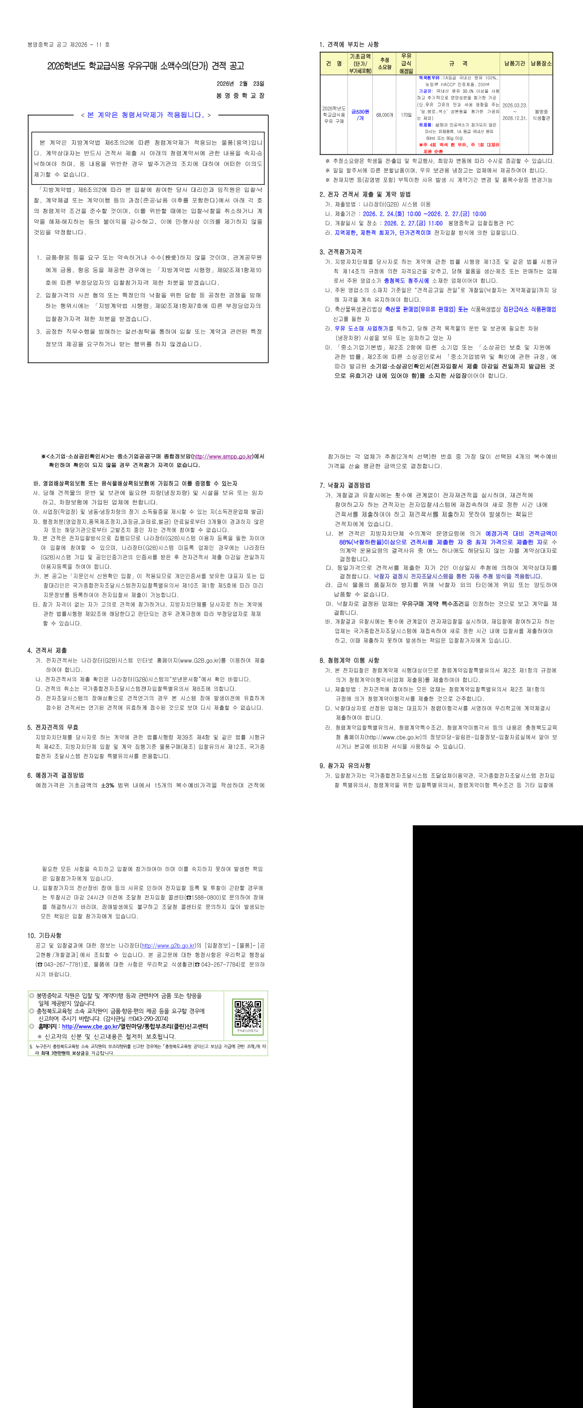 2026학년도 봉명중학교 학교급식 우유구매 소액수의(단가) 견적 공고 |