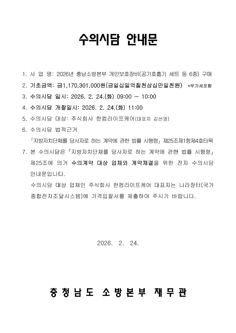 2026년 충남소방본부 개인보호장비(공기호흡기 세트 등 6종) 구매 |