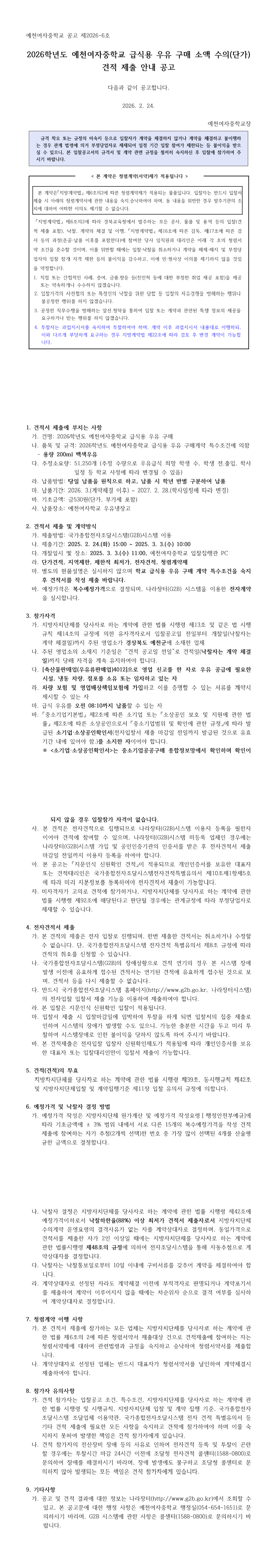 2026학년도 예천여자중학교 급식용 우유 구매 |