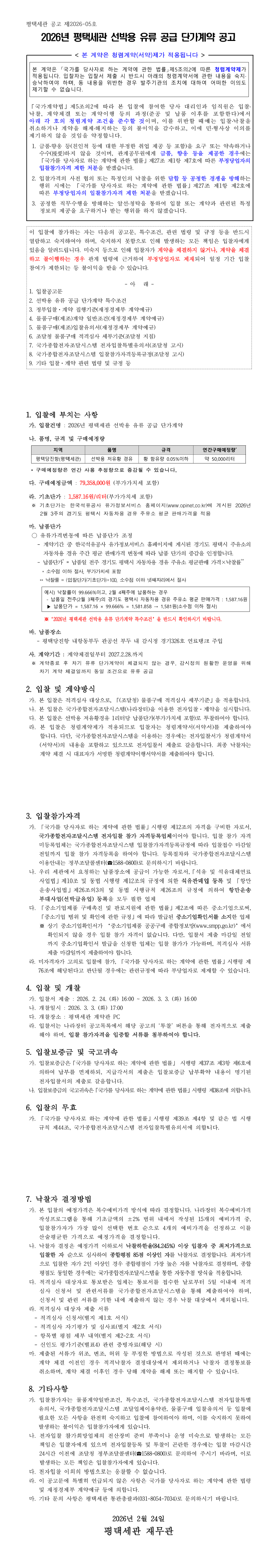2026년 평택세관 선박용 유류 공급 단가계약 |