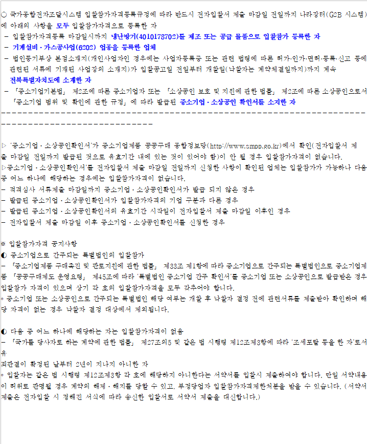 · 입찰에 참여하시기 전에반드시 공고서를 숙지하여 정확한 제한 업종을 확인하시기 바랍니다.