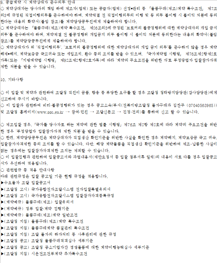 - 이 입찰 공고 건은 「국가를 당사자로 하는 계약에 관한 법률 시행령」 제73조와 「(계약예규) 정부 입찰