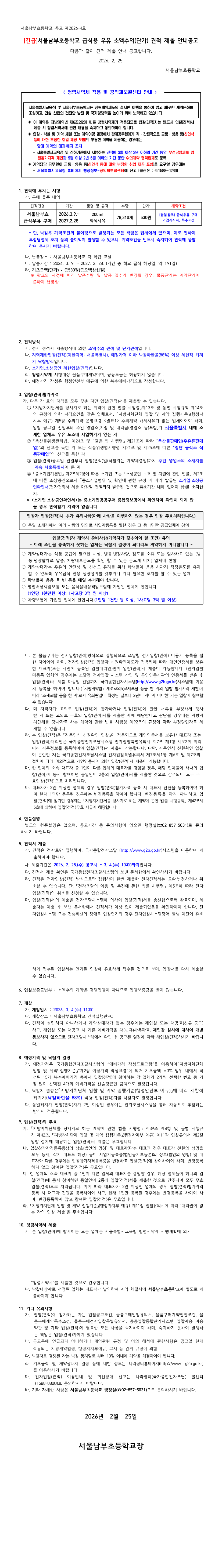 [긴급] 2026학년도 급식용 우유 구매 소액수의 견적공고 게시 |
