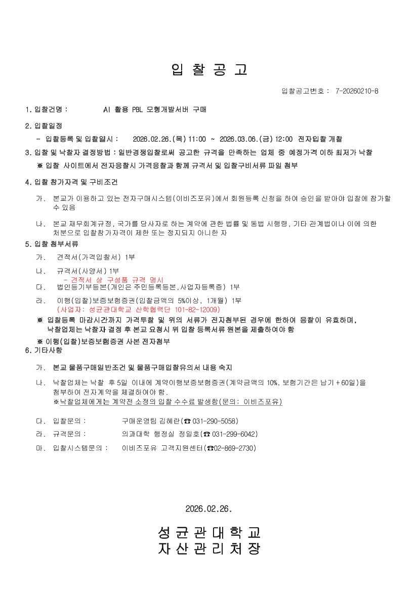 [7-20260210-8] AI 활용 PBL모형개발서버 구매(의과대학 교육혁신 지원사업(RISE 사업)) |