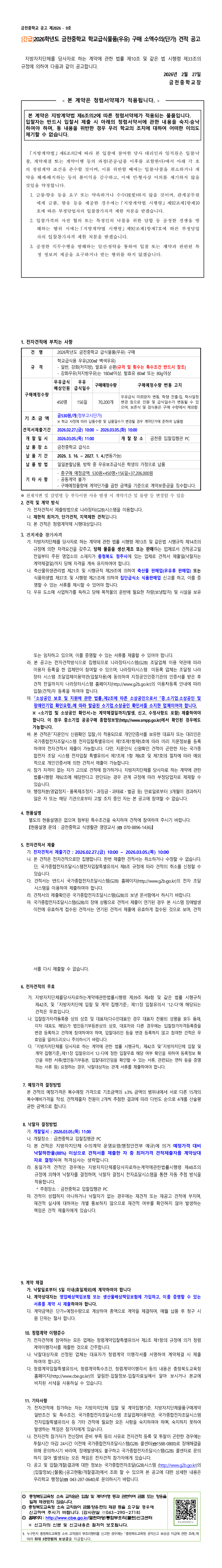 2026학년도 금천중학교 학교급식물품(우유) 구매 소액수의[단가] 견적 공고 |