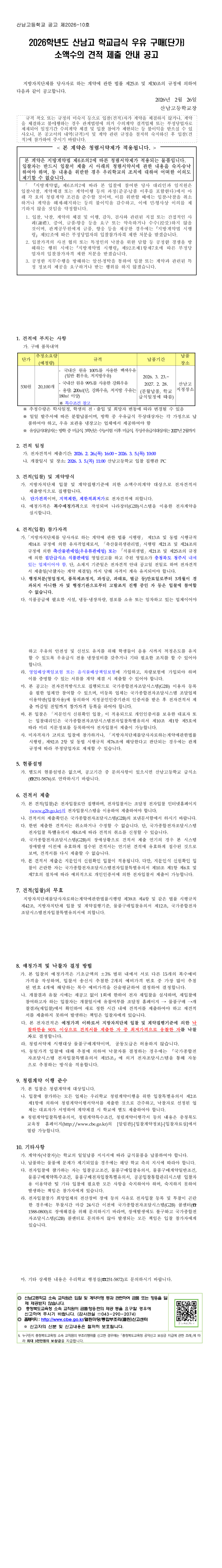 2026학년도 산남고 학교급식 우유 구매(단가) 소액수의 견적 제출 안내 공고 |