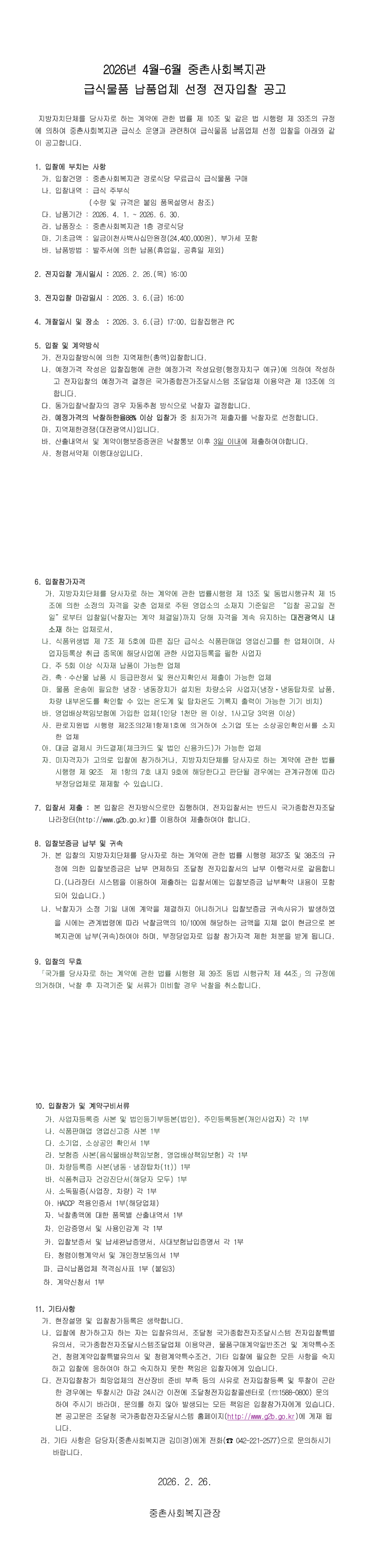 2026년 4월-6월 중촌사회복지관 급식물품 납품업체선정 |