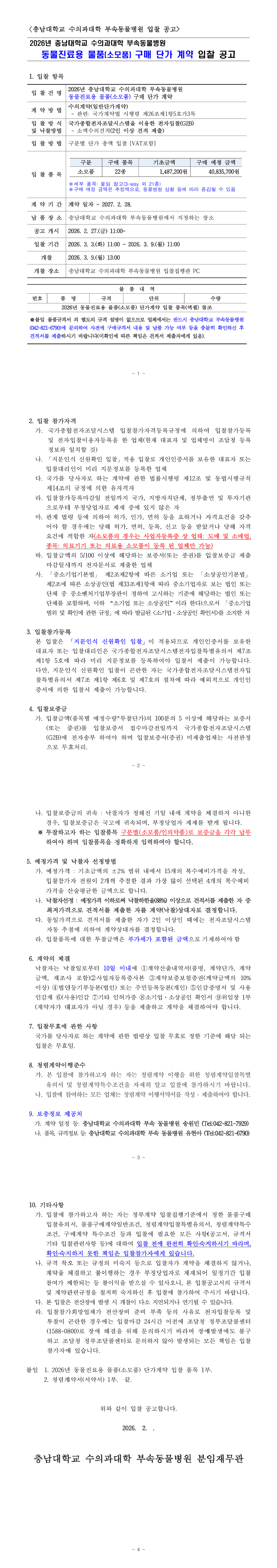 2026년 충남대학교 수의과대학 부속동물병원 동물진료용 물품(소모품) 구매 계약 공고(단가계약) |