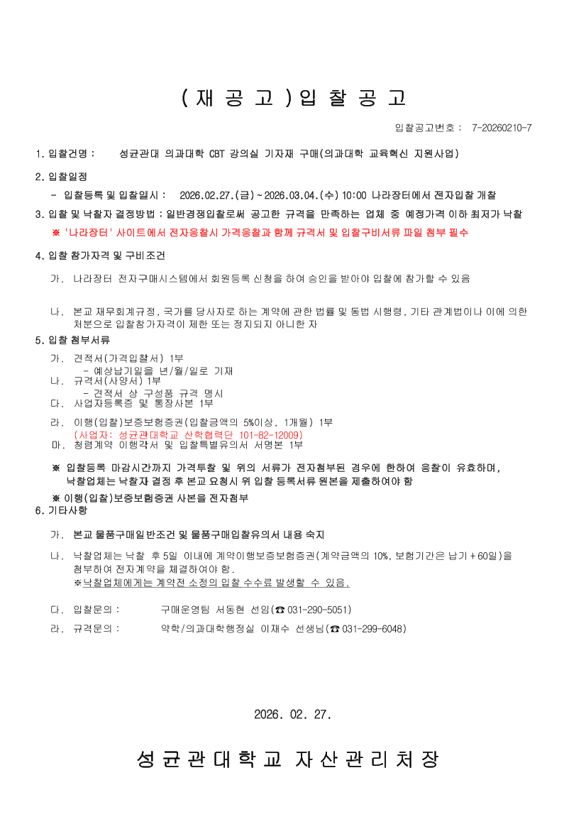 [성균관대(7-20260210-7)] 의과대학 CBT 강의실 기자재 구매(의과대학 교육혁신 지원사업) |