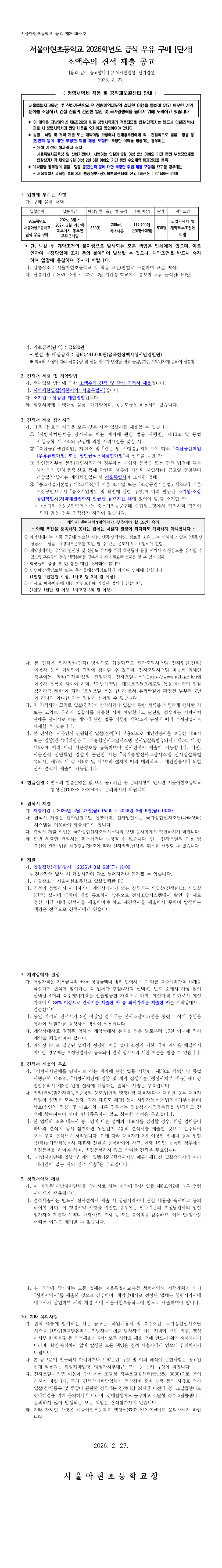 서울아현초등학교 2026학년도 급식 우유 구매(단가) 소액수의 견적 제출 |