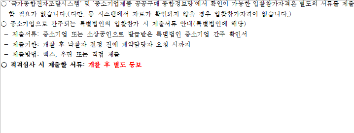 ○ 적격심사 대상자는 국가종합전자조달(G2B)시스템을 통하여 통보(받은 문서함에서 확인)하며, 적격심사에 소요되는 행정소요일수를 감안하여 필요한 경우 예정가격이내 입찰자를 대상으로 동시에 적격심사서류 제출을 요구할 수 있습니다.