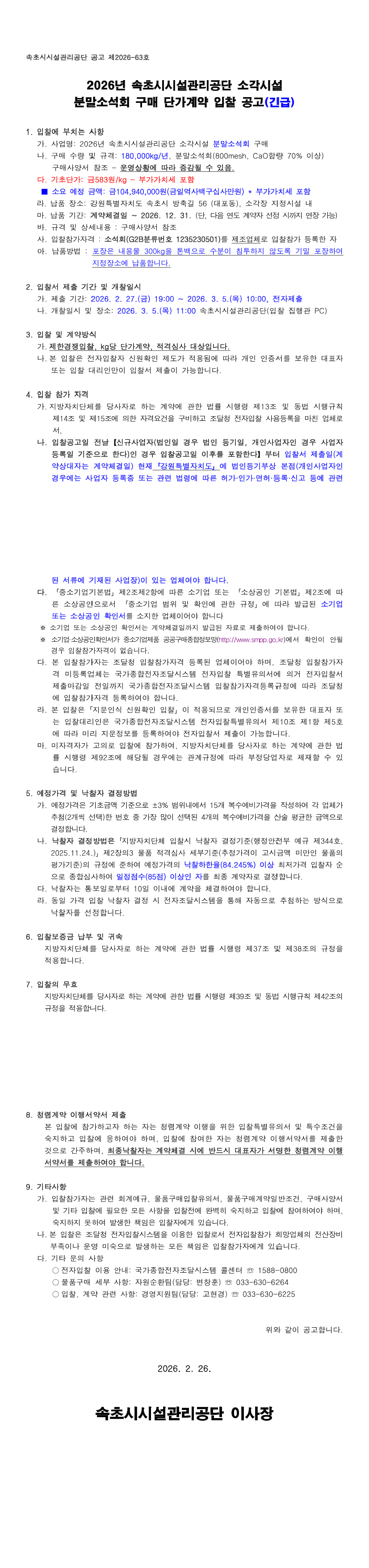 2026년 속초시시설관리공단 소각시설 분말소석회 구매 단가계약 |