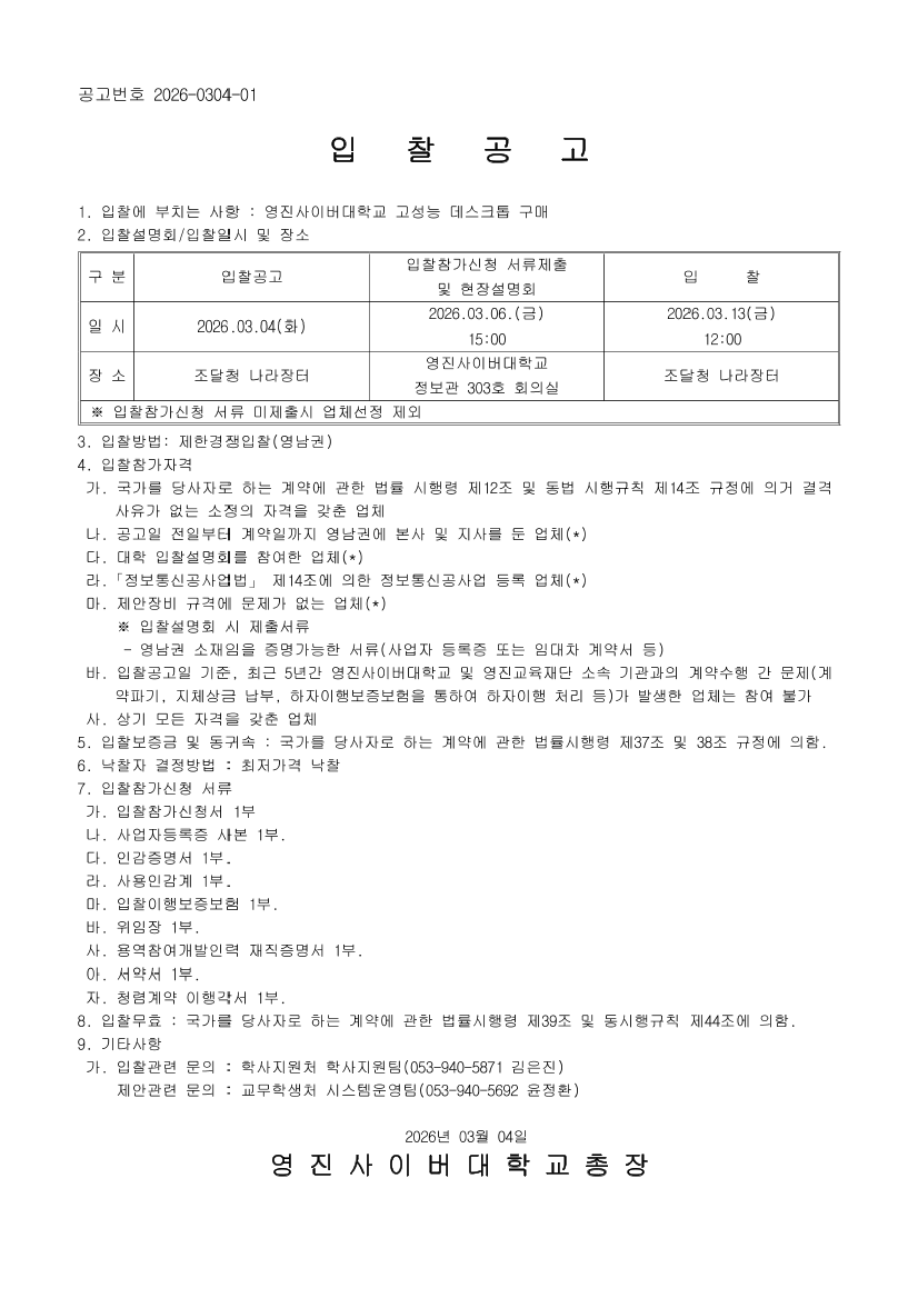 공고명 영진사이버대학교 고성능 데스크톱 구매