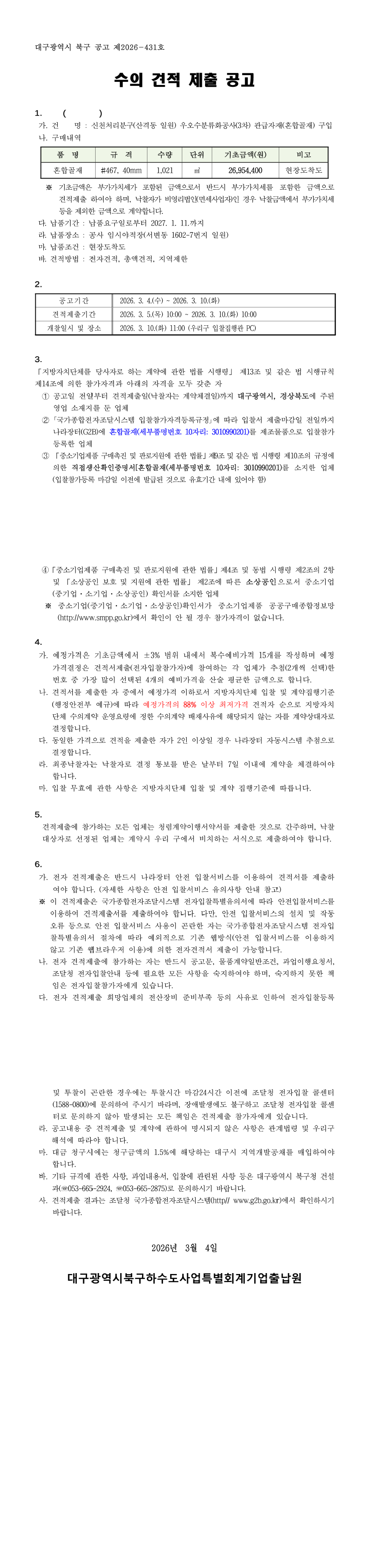 신천처리분구(산격동 일원) 우오수분류화공사(3차) 관급자재(혼합골재) 구입 수의견적 제출 공고 |