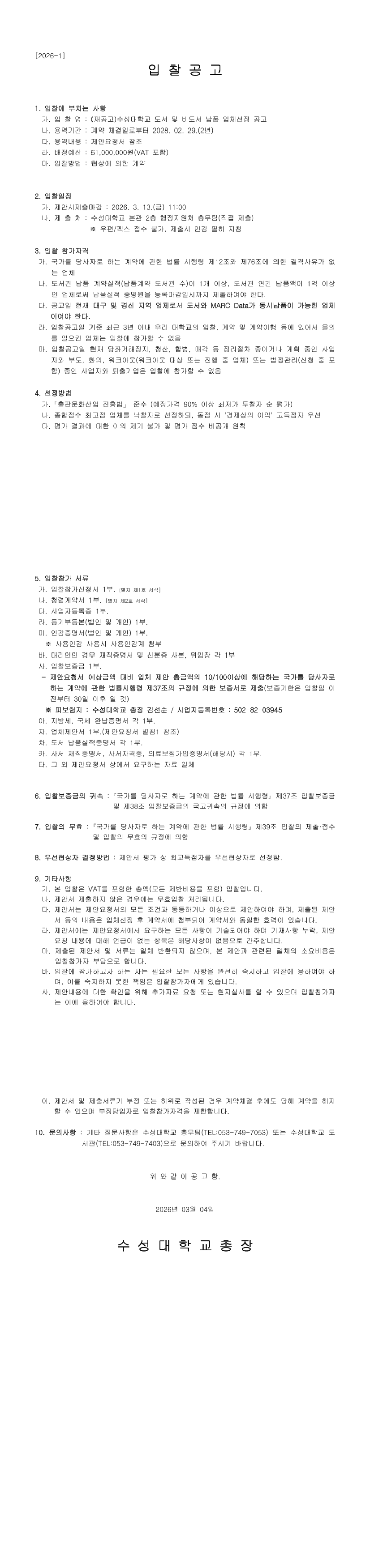 (재공고)수성대학교 도서 및 비도서 납품 업체선정 공고 |