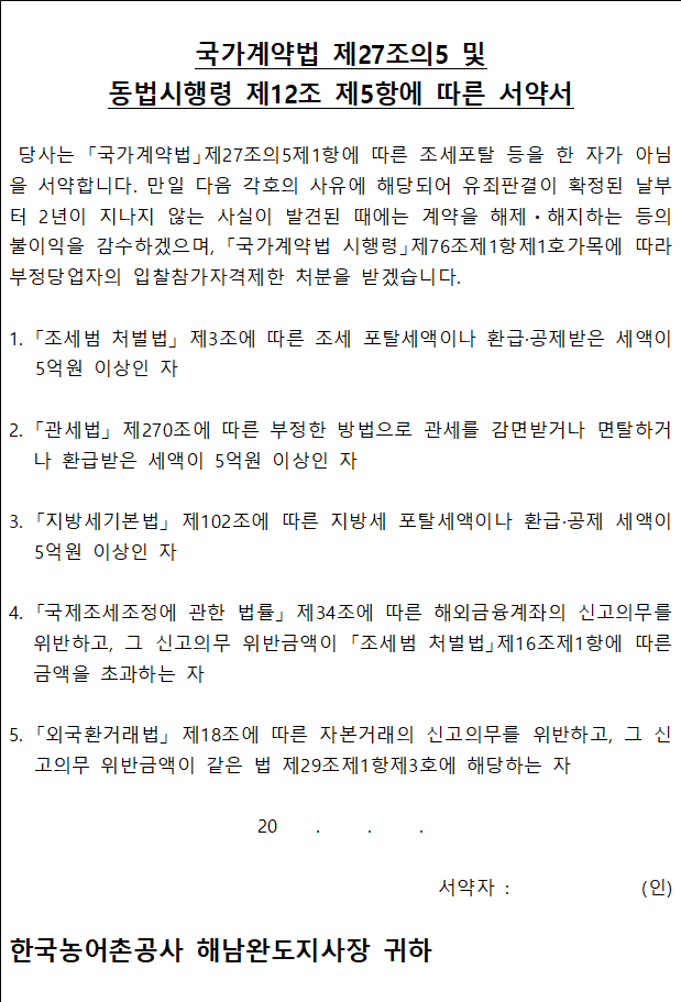 다. 본 입찰에 참가하는 자는 「국가계약법」 제27조의5 제1항 및 「같은 법 시행령」 제12조제3항에 의거 조세포탈 등을 한 사실이 없는 것으로 간주하며, 조세포탈 등의 사실이 확인될 경우 계약 해제·해지, 부정당업자제재 등의 처분을 받을 수 있습니다. 또한 계약상대자로 선정되는 자는 계약체결 시 “조세포탈 유무 확인 서약서”를 제출하여야 합니다. 다만, 나라장터를 이용하여 입찰서를 제출하는 경우에는 전자입찰서에 동 서약서의 내용을 포함하고 있으므로 전자입찰서 제출로 서약서 제출을 갈음합니다.