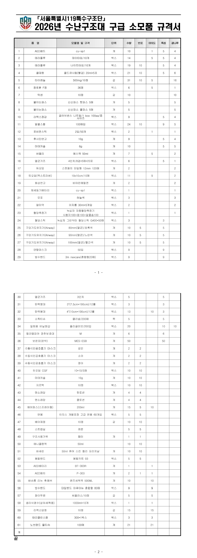 2026년 서울시119특수구조단 수난구조대 구급 소모품 구매 |