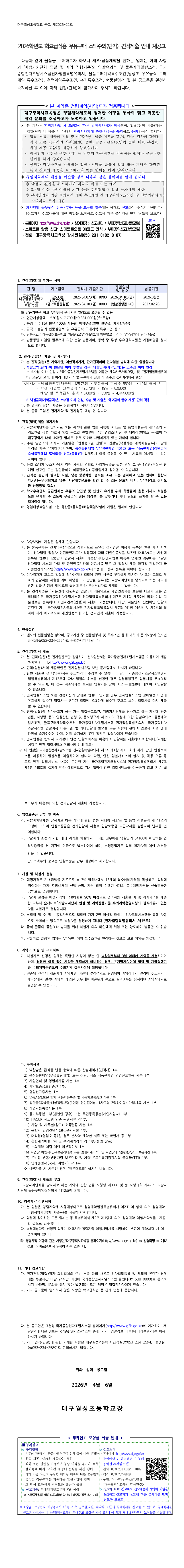 2026학년도 학교급식용 우유구매 소액수의(단가) 견적제출 안내 재공고 |