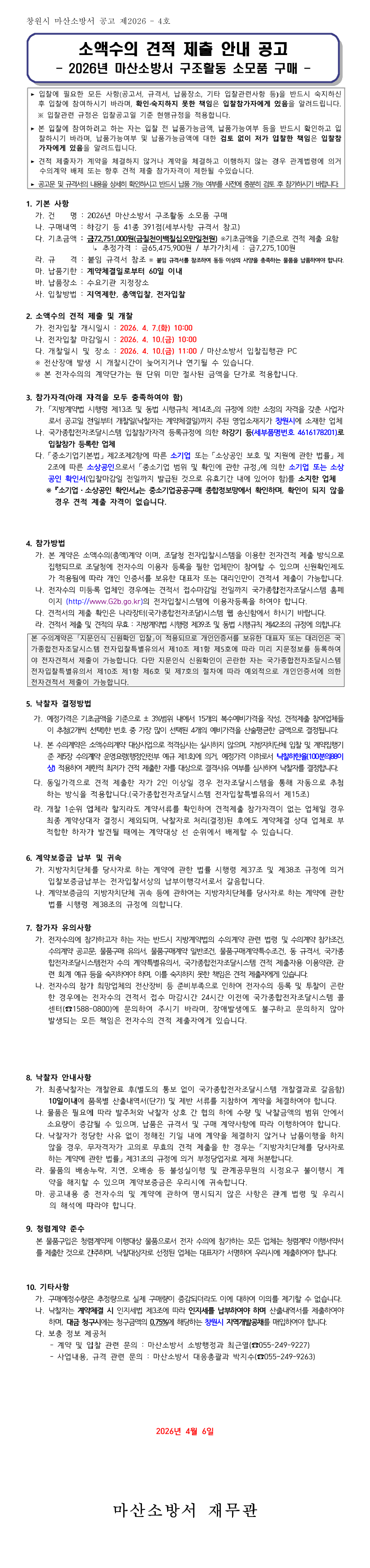 소액수의 견적 제출 안내 공고(2026년 마산소방서 구조활동 소모품 구매) |