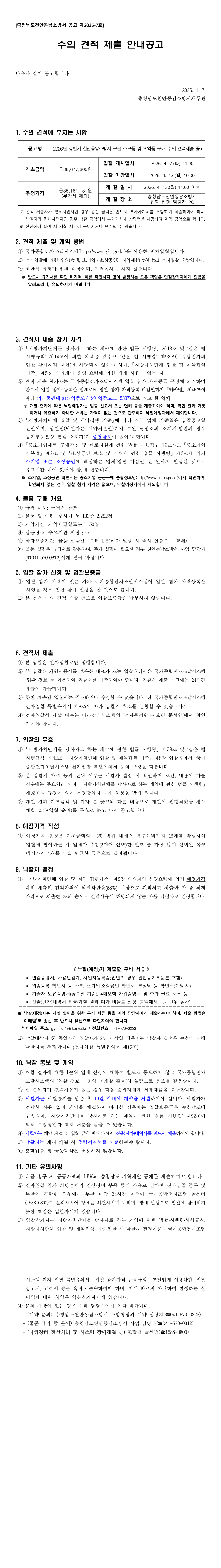 2026년 상반기 천안동남소방서 구급 소모품 및 의약품 구매 수의 견적제출 공고 |