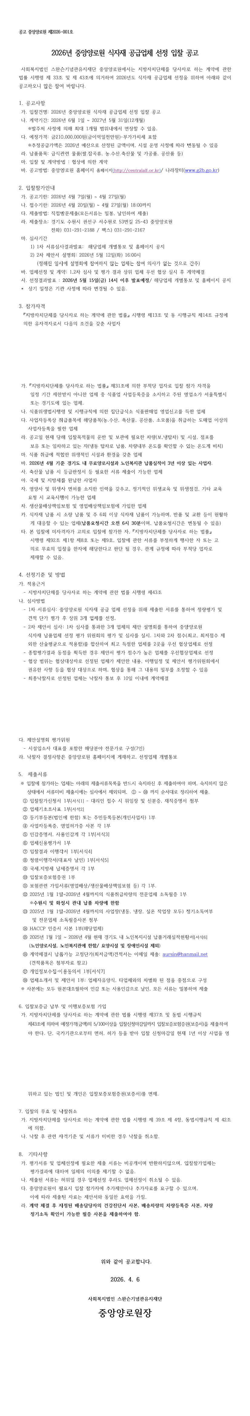 2026년 중앙양로원 식자재 공급업체 선정 입찰 공고 |