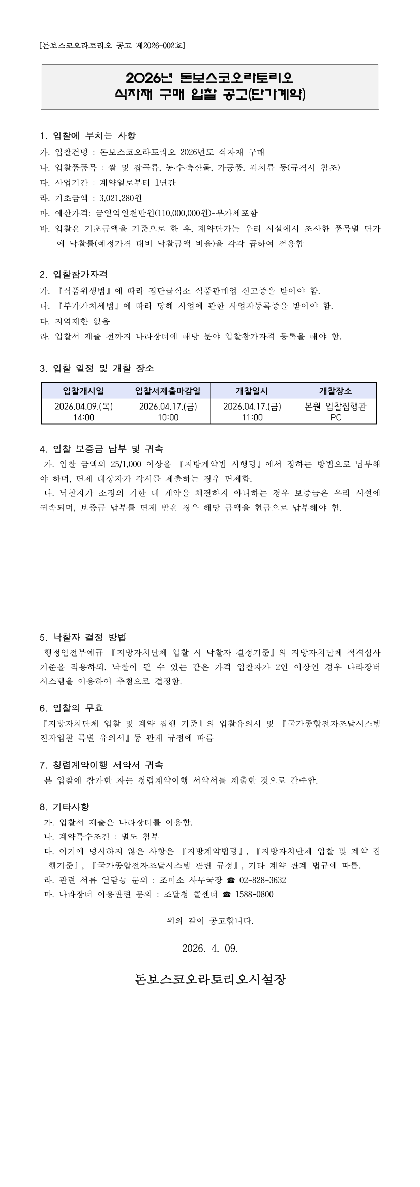 돈보스코오라토리오 2026년도 식자재 구매(단가계약) 입찰 공고 |