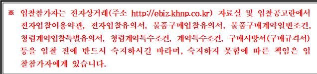 나. 본 입찰에 참가하고자 하는 자는 청렴계약 이행을 위한 한국수력원자력(주)의 입찰유의서 및 계약일반조건의 관련 규정을 숙지하고 청렴계약 및 공정거래이행각서에 서명하여야 하며, 청렴계약 및 공정거래이행각서는 우리 회사 전자상거래시스템(http://ebiz.khnp.co.kr)에 게재되어 있습니다.
