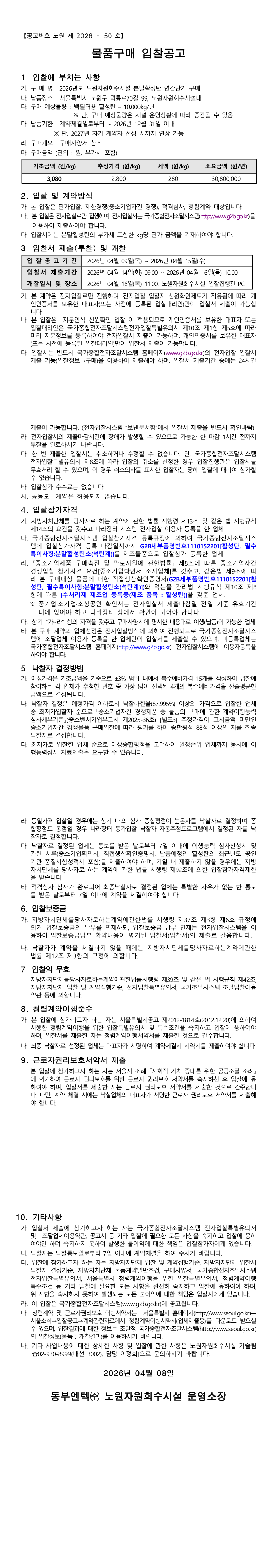 2026년도 노원자원회수시설 분말활성탄 연간단가 구매 |