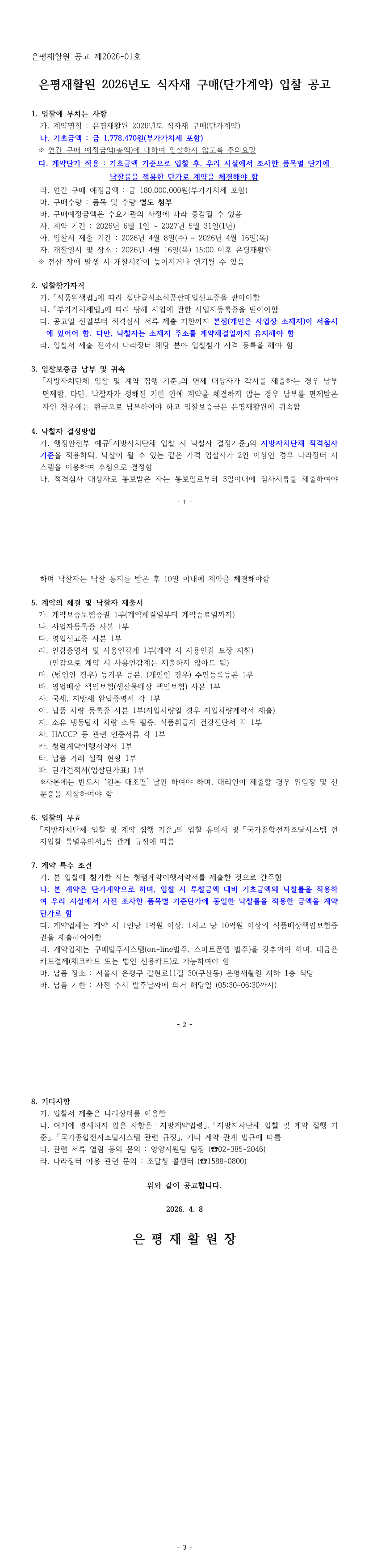 은평재활원 2026년도 식자재 구매(단가계약) 입찰 공고 |