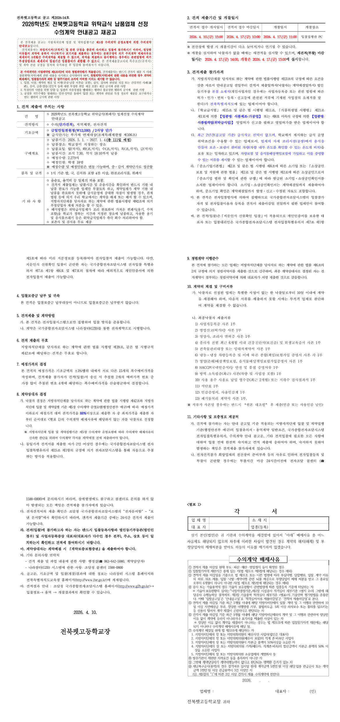2026학년도 전북펫고등학교 위탁급식 납품업체 선정 수의계약 안내공고 재공고 |