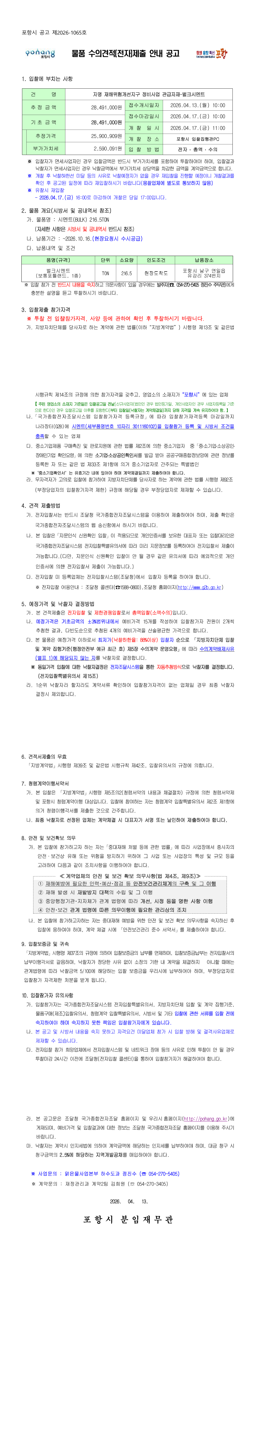 자명 재해위험개선지구 정비사업 관급자재-벌크시멘트 |
