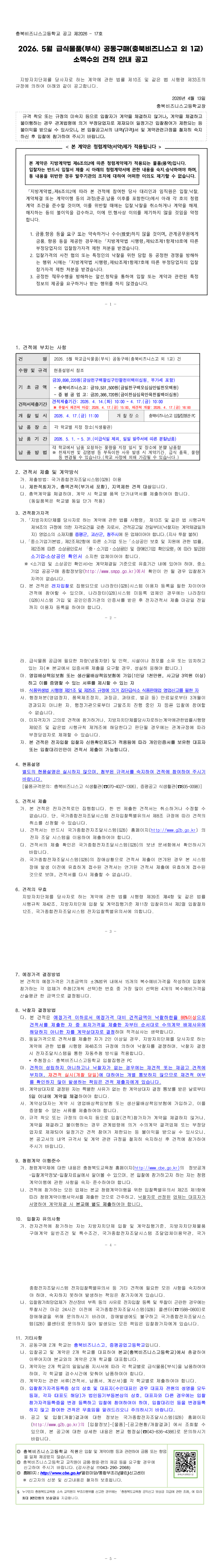 5월 학교급식물품(부식) 공동구매(충북비즈니스고 외 1교) 소액수의 견적 공고 |