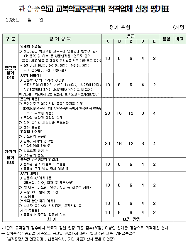 2026학년도 관음중학교 교복(하복, 동복)구매 2단계(규격-가격 동시) 입찰 공고