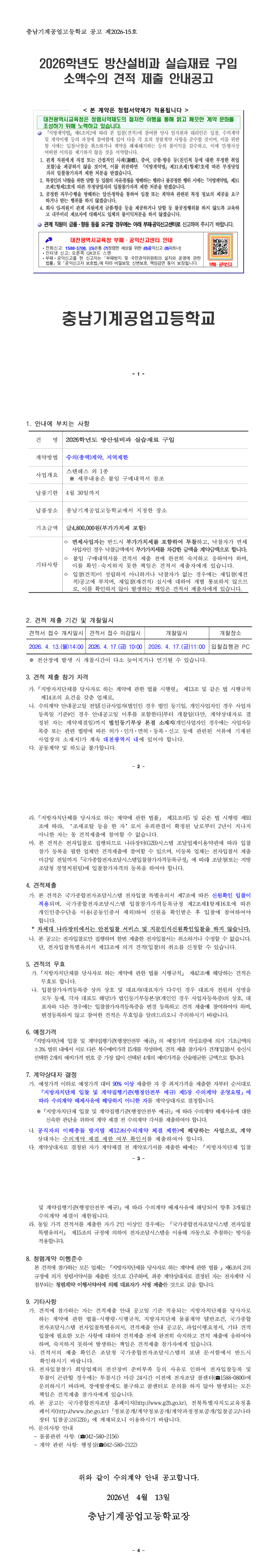 충남기계공업고등학교 방산설비과 실습재료 구입 소액수의 견적 제출 안내 공고 |