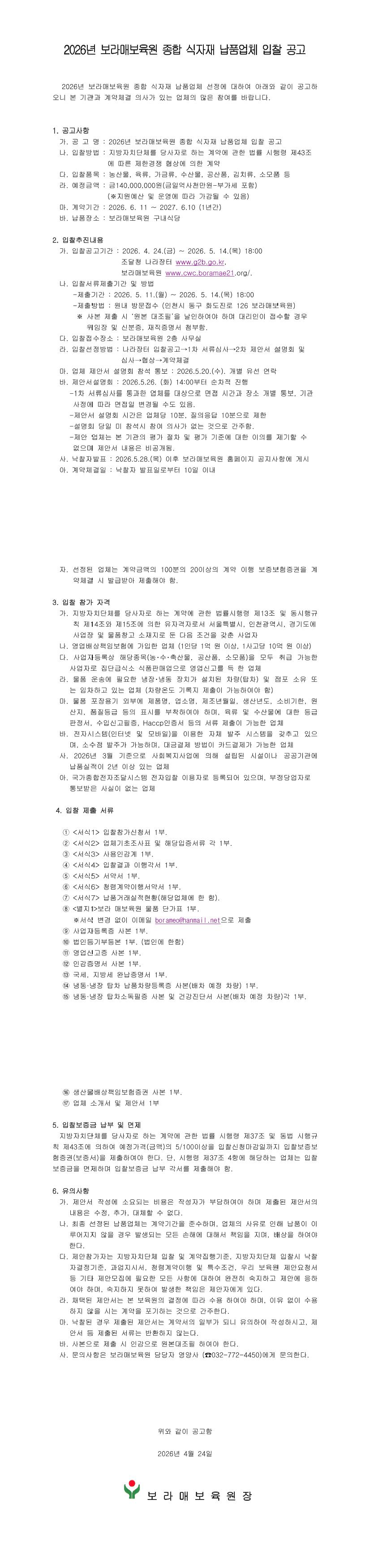 2026년 보라매보육원 종합 식자재 납품업체 입찰 공고 |